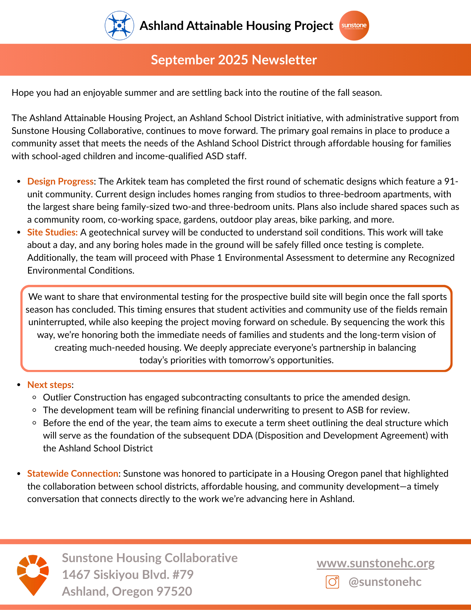 Starting this month, Sunstone will release a monthly newsletter to update the community on the progress of the Ashland Attainable Housing Project.